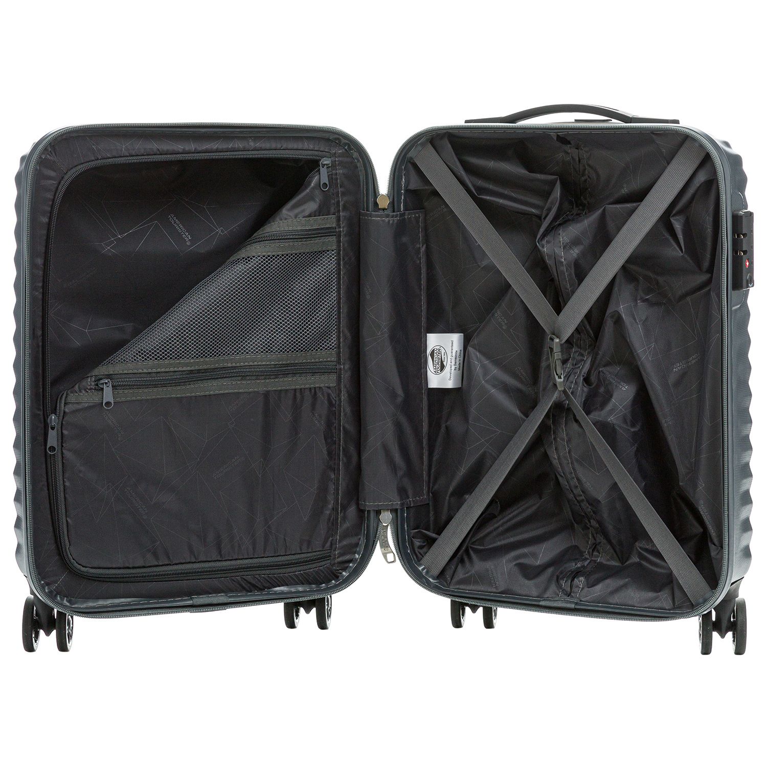 Внутри находится перегородка с двумя карманами на молнии, включая сетчатый, и крестообразные прижимные ремни. Кодовый замок TSA позаботится о сохранности содержимого. Детали интерьера выполнены в цветовой гамме чемодана.