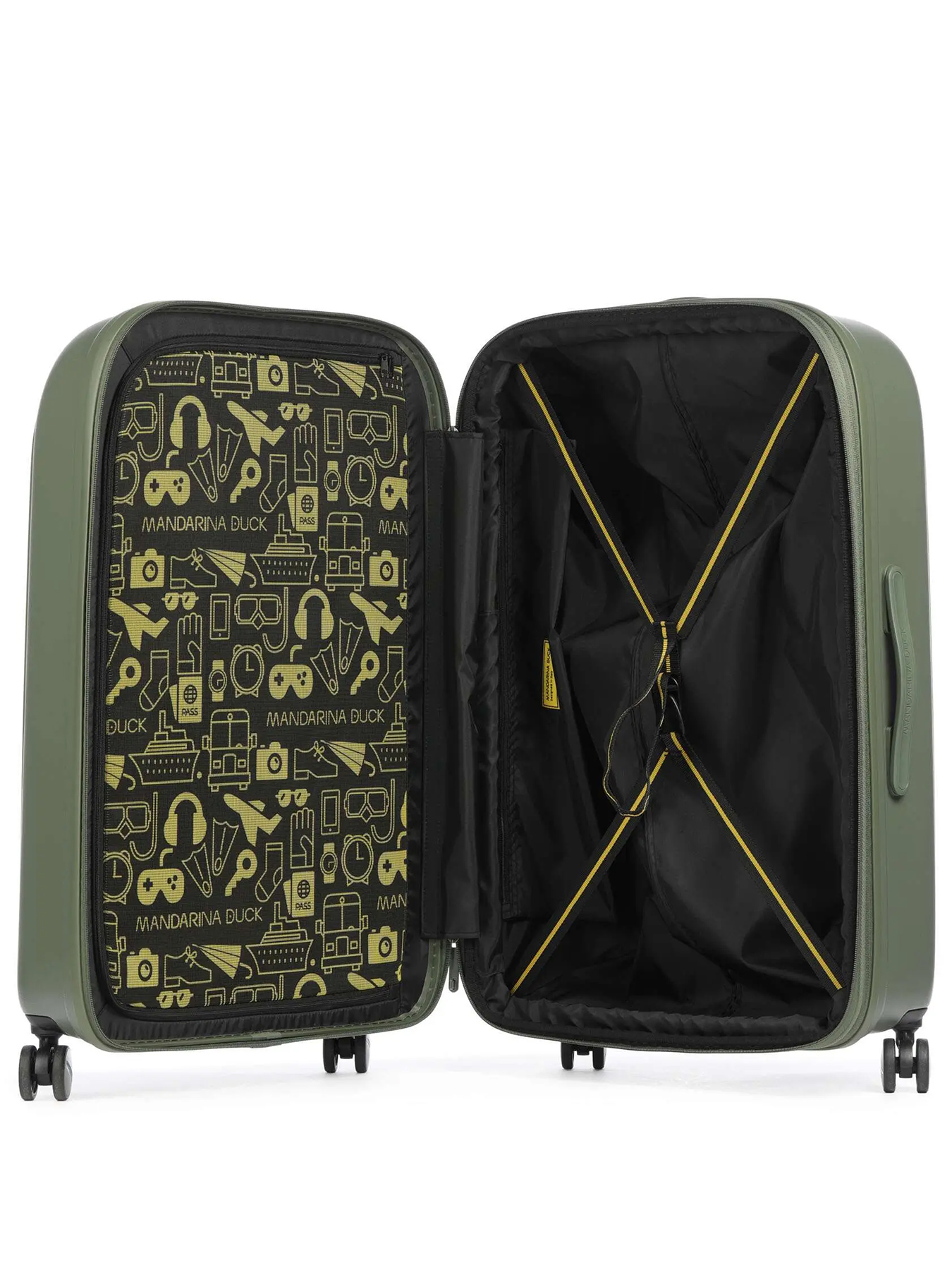 Коллекция чемоданов из поликарбоната Mandarina Duck Logoduck+ стала настоящим бестселлером! Среди других производителей похожих моделей не найти: обтекаемые изящные формы, колёса в тон корпуса, крупный логотип бренда, подкладка с принтом и яркие цвета делают их уникальными в своём роде.