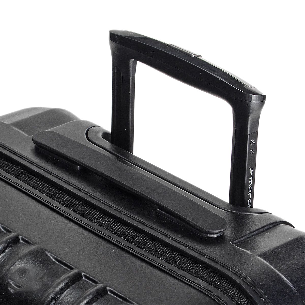 Выдвижная алюминиевая ручка фиксируется в трех положениях. Чемодан имеет две дополнительные ручки сверху и сбоку для удобства переноски.