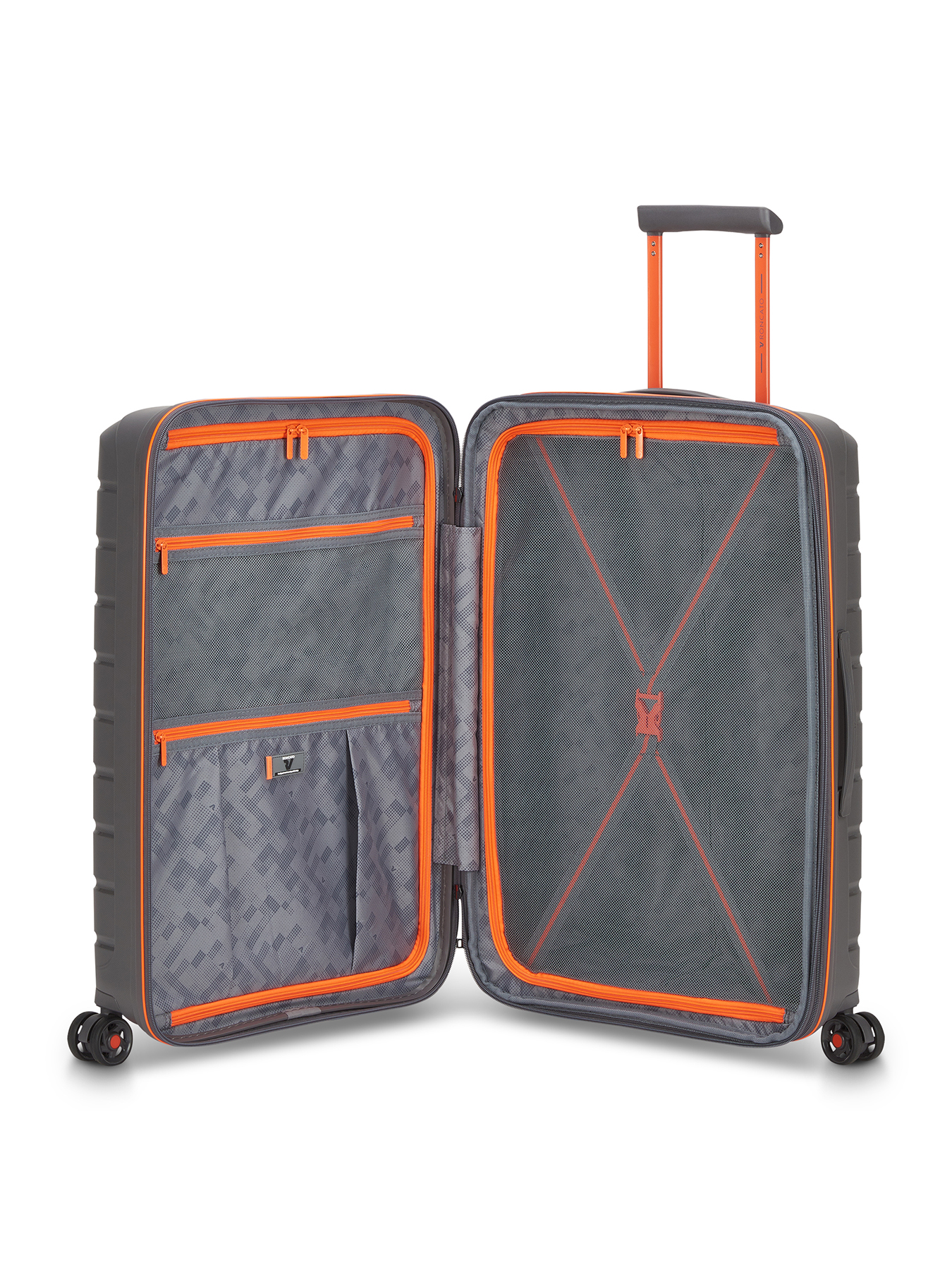 Внутри чемодана Roncato B-Flying Move — функциональная организация: одно отделение с сетчатым разделителем и прижимными ремнями увеличивается в объеме, а второе оснащено перегородкой на молнии с двумя карманами. Пластиковый чемодан Roncato — надежный компаньон для новых открытий!